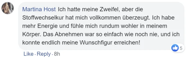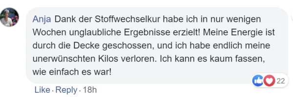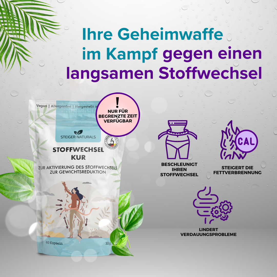 Die Stoffwechselkur enthält patentierte Inhaltsstoffe, die Ihre Fettverbrennung ankurbeln und Ihren Bauchumfang reduzieren.
